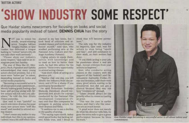 "I don't mean any malice to any individual, but this is my opinion. I admit, I was a bit stuff when I first started in my late teens, but I took heed of criticism and attended classes an workshops to better myself," said Que, who studied performing arts at the National Arts, Culture and Heritage Academy (ASWARA).