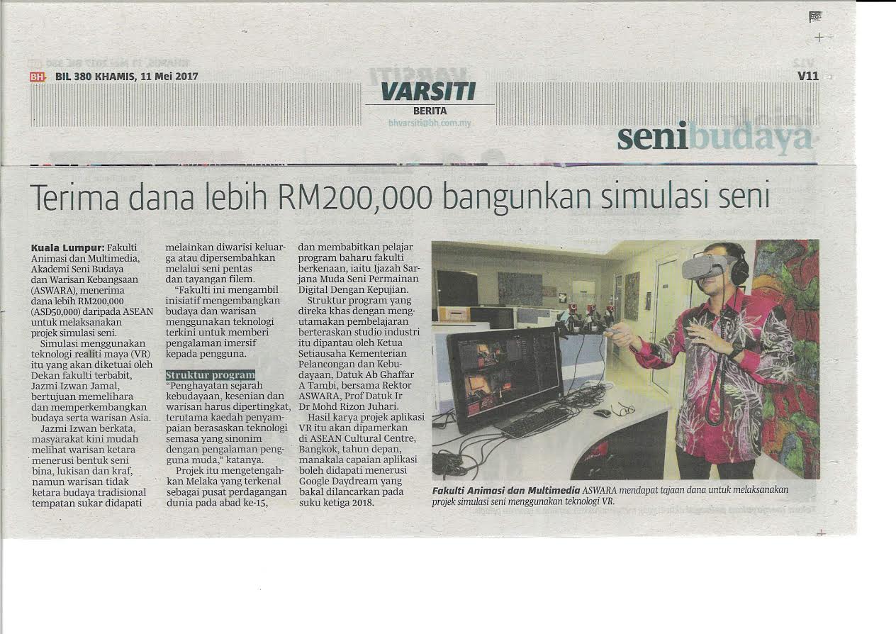 Fakulti Animasi dan Multimedia, Akademi Seni Budaya dan Warisan Kebangsaan (ASWARA), menerima dana lebih RM200,000 (ASD50,000) daripada ASEAN untuk melaksanakan projek simulasi seni.
