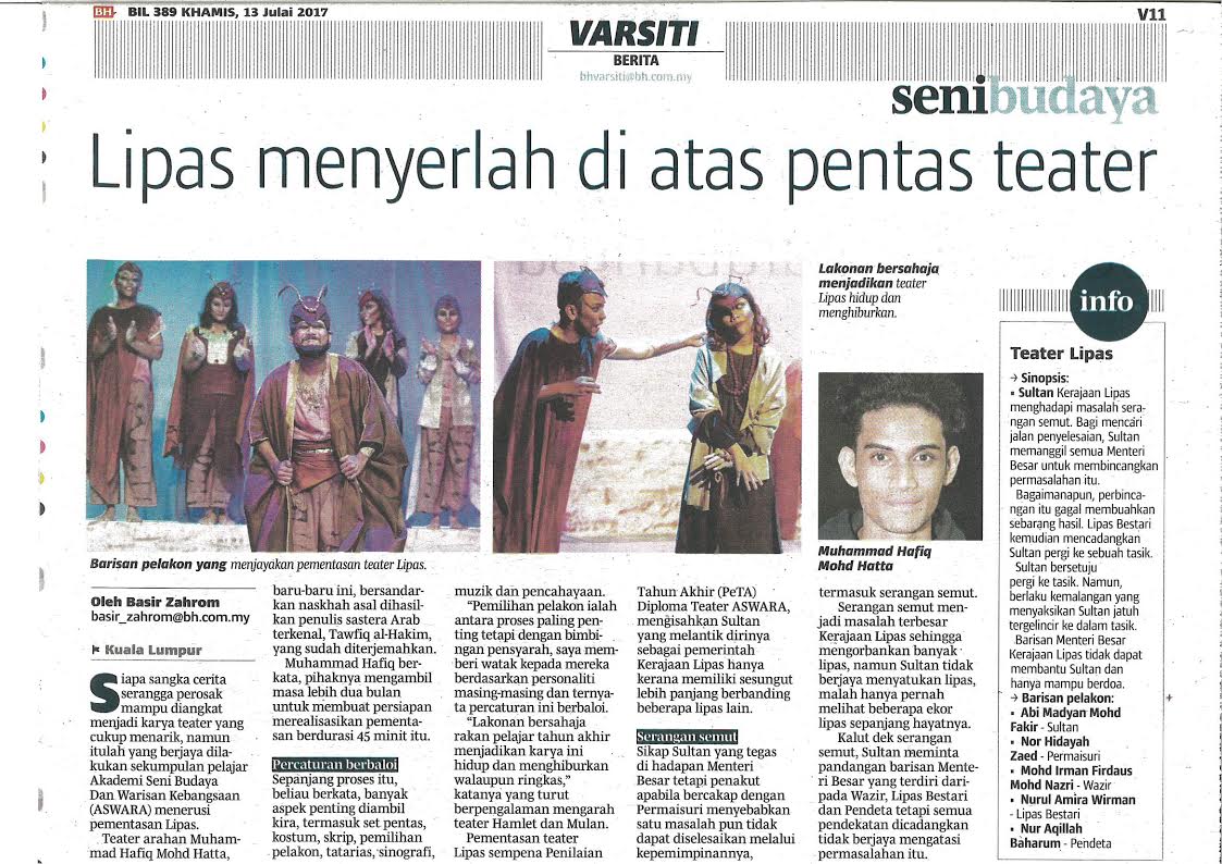 Siapa sangka cerita serangga perosak mampu diangkat menjadi karya teater yang cukup menarik, namun itulah yang berjaya dila- kukan sekumpulan pelajar Akademi Seni Budaya Dan Warisan Kebangsaan (ASWARA) menerusi pementasan Lipas.