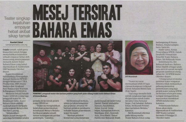 Gejala rasuah, salah guna kuasa dan tamak hingga menyebabkan kejatuhan sebuah empayar hebat oleh kuasa asing antara paparan menarik dalam Teater Bahara Emas yang bakal dipentaskan di Auditorium DBP bermula Oktober depan.