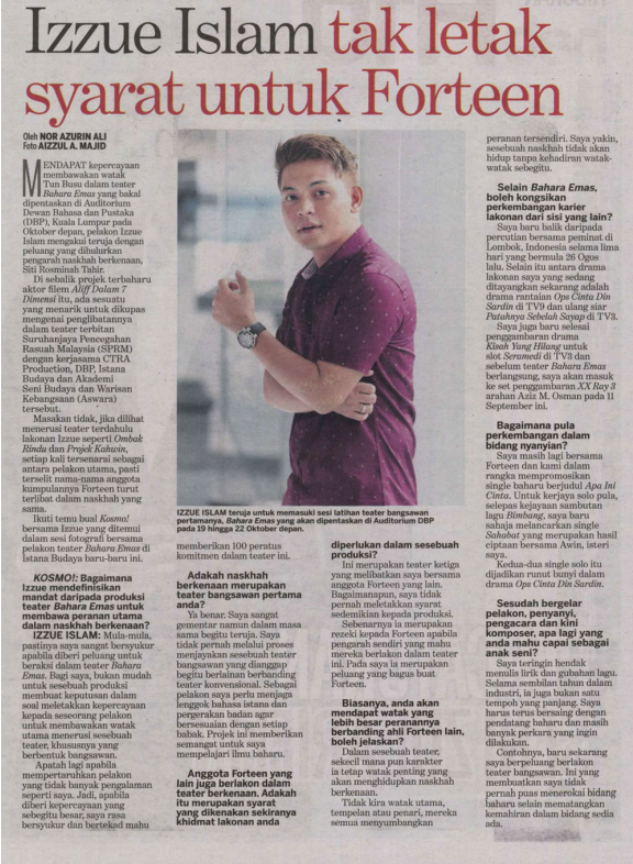 Di sebalik projek terbaharu aktor filem Aliff Dalam 7 Dimensi itu, ada sesuatu yang menarik untuk dikupas mengenai penglibatannya dalam teater terbitan Suruhanjaya Pencegahan Rasuah Malaysia (SPRM) dengan kerjasama CTRA Production, DBP, Istana Budaya dan Akademi Seni Budaya dan Warisan Kebangsaan (Aswara) tersebut.