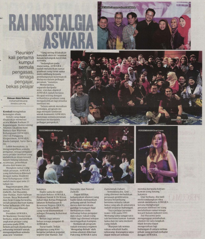 Inilah yang dapat disaksikan menerusi acara Malam Raikan 23 Kepulangan: Homecoming Alumni Akademi Seni Budaya dan Warisan Kebangsaan (ASWARA 2017) di Panggung Eksperimen, ASWARA.